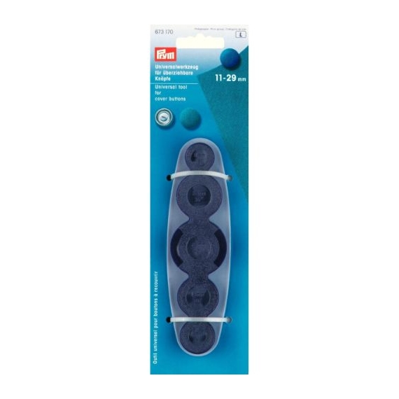 Premium quality as always by Prym. For helpful covering of coverbuttons this handy tool covers all sizes. It holds your fabric in place while you can use the tool to cover your Prym cove buttons. No need for multiple tools this one does the lot.