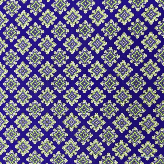 Return to Hope Royal Blue and Green 100% patterned Fabric. The small diamond shapes are enhanced with metallic gold hints, producing an elegant design with trendy colours.