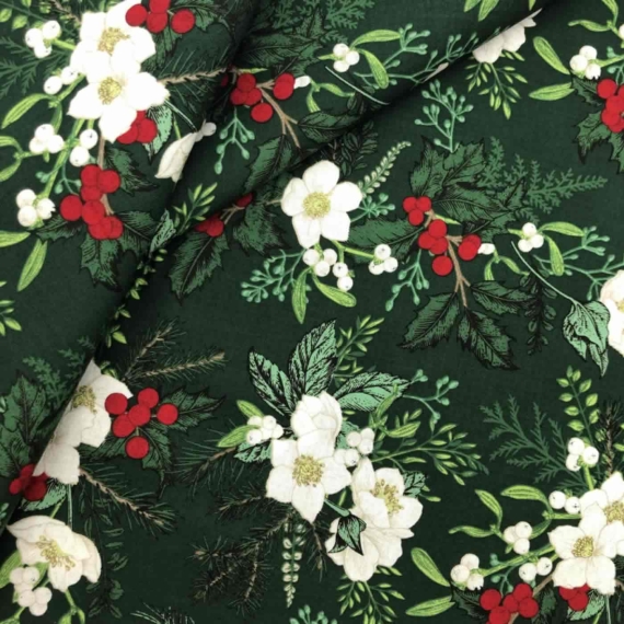 Add this lovely floral Christmas fabric to your next Christmas Project! This fabric is 100% Cotton and is in the wide length of 53 inches / 136cm so ideal for quilt backing too!