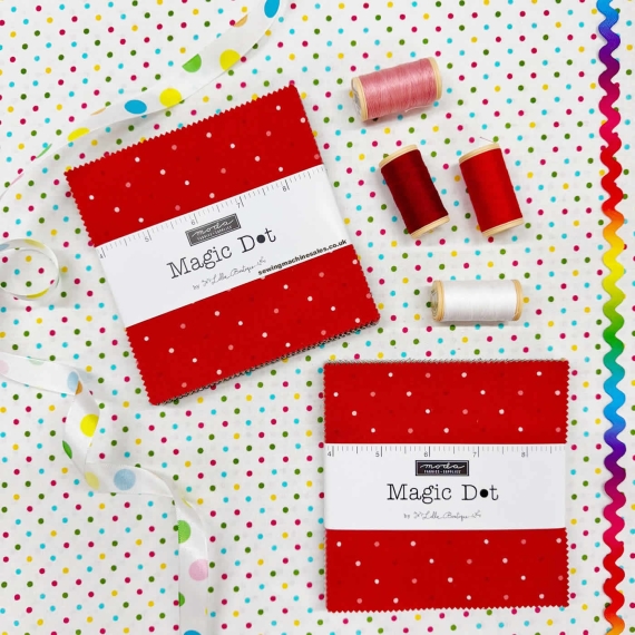 This charm pack features the entire collection of Magic Dots, a multi coloured range of polka dot patterned fabrics. There are 42 5 inch squares, each with a different coloured polka dot design from this collection. Some designs maybe duplicated to create the pack of 42.