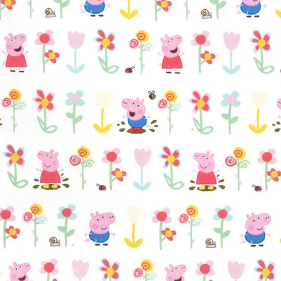 This is a 100% cotton fabric with a Peppa Pig design with bright coloured flowers, ideal for childrens dressmaking, quilting and garden/outdoor projects.