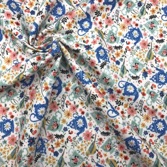 will bring joy to your sewing room as you sew projects for family and friends.This design Julia is sure to make you smile with bright florals, pops of fruit, tea cups and cute little birdies.
