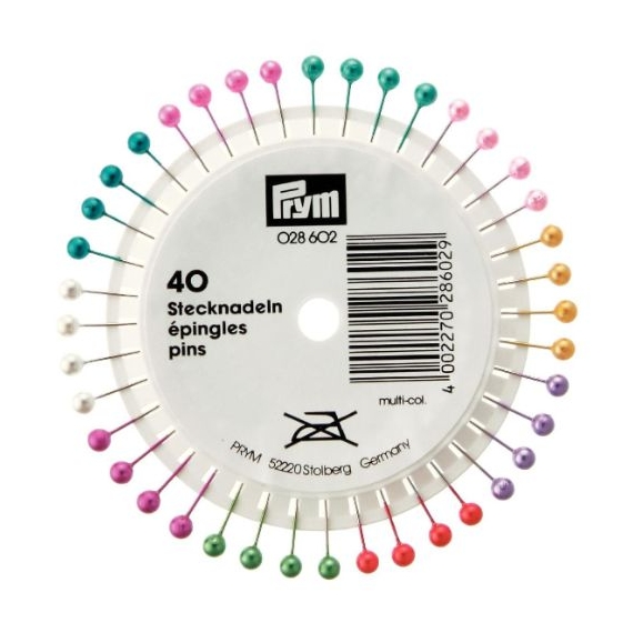 Premium quality as always by Prym. Assorted Coloured Pearlised Plastic headed pin wheel are common place in any sewers toolkit. Easy to carry any easy to store. Less than 5p per pin and they will last a long time.
