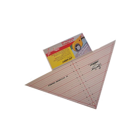 The perfect ruler for cutting outside triangles for blocks up to 10". Essential for designs where the blocks are set on-point. Use also to cut 90 degree quarter-square triangles from strips and save fabric. Easy to use and very accurate.