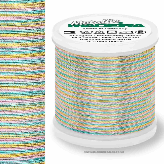 Machine embroidery Variegated Metallic thread 40wt in mixed colours. This multi stranded twisted thread gives good highlighting effect.