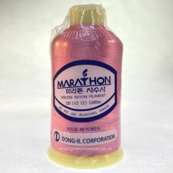 Marathon Watermelon Pink thread is ready to use straight from it's cone. Each cone is 1000m which will last you a good length of time when embroidering. It is Viscose Rayon Filament which can be used on regular sewing machines or on any type of embroidery machine, whilst doing decorative stitching.