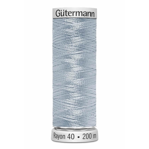 It is rayon and produces a bright shine, the spool contains 200 Mtr with the usual Gutermann quality and strengh.