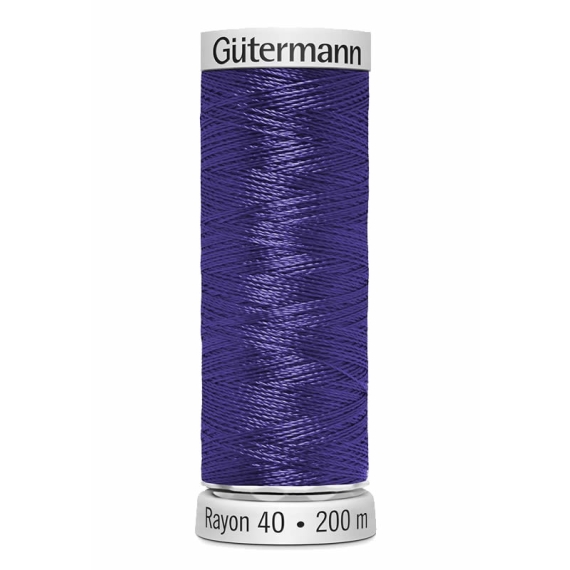 It is rayon and produces a bright shine, the spool contains 200 Mtr with the usual Gutermann quality and strengh.