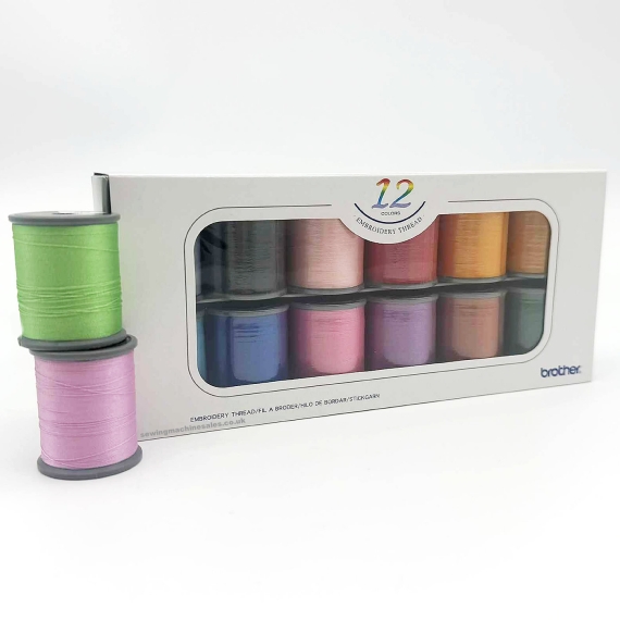 This set of threads includes 12 assorted colours of high-quality Brother machine embroidery thread, each supplied on a large 300m satin-finish spool.