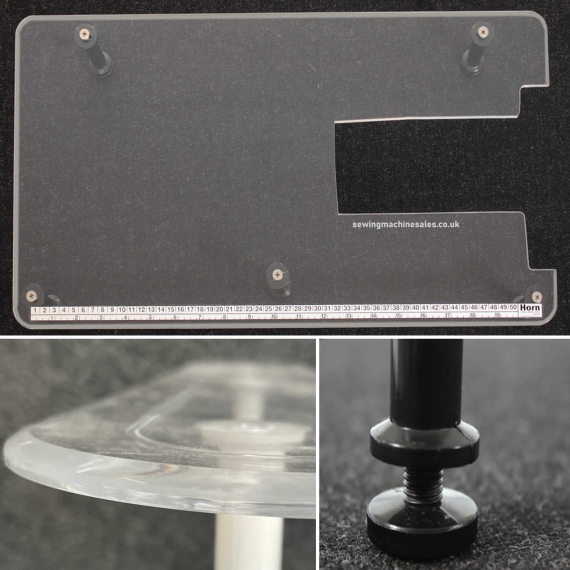 It extends the regular sewing area to the left, rear and to the front. The total size is 24" x 19". A handy measure is on the surface. It is tough, durable, and manufactured from 6 mm acrylic.