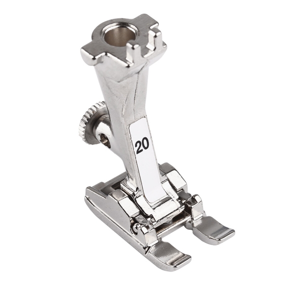 The bottom of the foot has a wedge shaped indentation, which allows even satin stitching to glide under the foot without dragging. The angle in the indentation makes it possible to turn curves easily.