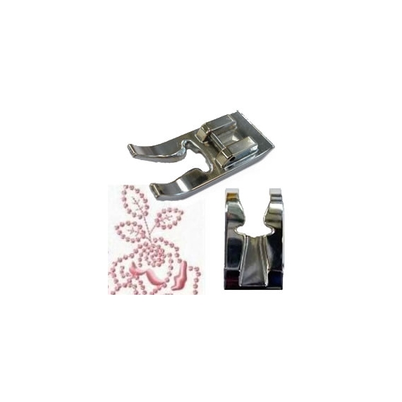 Candlewicking stitch is similar to a handsewn "knot" which is used to add extra depth to a decorative design on linens. Use candlewicking to embellish pillows, table linens, bed linens and clothing or to stitch down applique shapes or ribbons. This candlewicking foot has a specially formed, deep tunnel on the underside which allows the raised candlewicking stitches to pass under the foot easily. Ideal not only for candlewicking stitches, but for other raised stitches like satin stitching. It can also be used for sewing with heavy thicker type cotton threads for fancy effects.