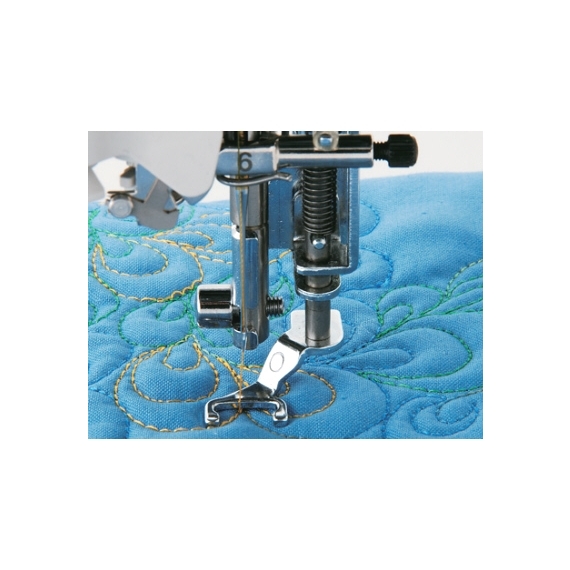 Metal Quilting Foot with a open toe, so the needle can be seen more clearly while embroidering a design. This foot is also called a darning foot and may be used as a free motion foot. The foot spring loaded and rises then lowers with the needle to allow fabric to be moved between stitches and to hold fabric in place while stitches are created. Brother Open Toe Free Motion Embroidery/Quilting Metal Foot.