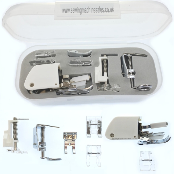 A decorative foot set containing 7 different for top loading Singer, Brother and Janome models