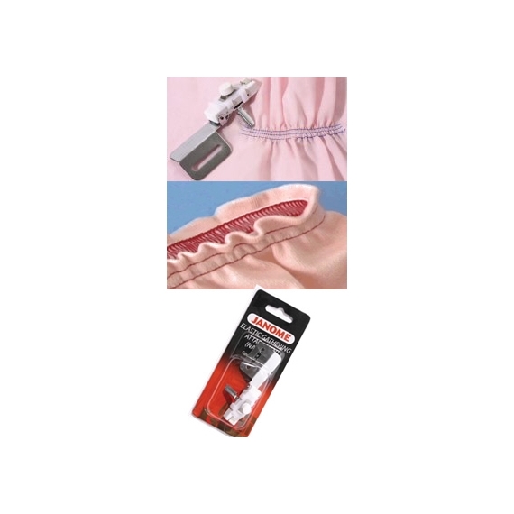 Upgrade your sewing machine with the Janome Coverpro Elastic Gathering Attachment (Narrow), and enjoy the ease and precision of gathering fabric with narrower elastic.