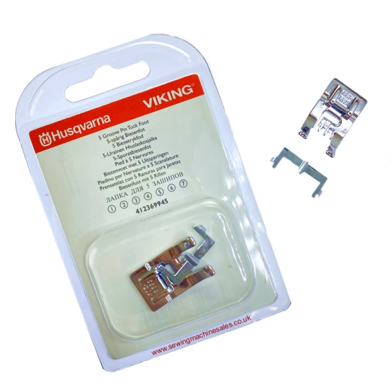 This 5 groove pin tuck foot from Husqvarna is used to give a rasied feect on pin tucks. The cord goes beneith the material to give the raise.