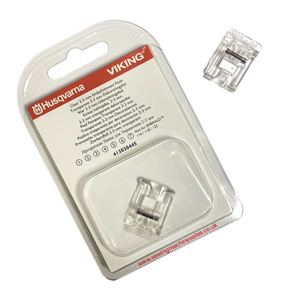 The foot is a clear, plastic frame so you can see your project super clearly. There is a small tunnel on the bottom of the foot to allow room for the embellishment to go under.