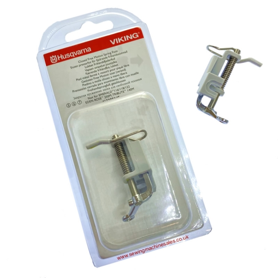 This closed free motion spring foot from Husqvarna is ideal for quilting and stitching. It gives great visibility around the foot and the red markings on the foot are useful for stitch guiding.Â
