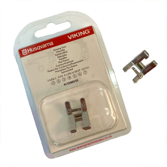 This gimping foot is ideal for creating dimentional satin stitches. Gimp thread is guided by the foot as the stitch is sewn over it.