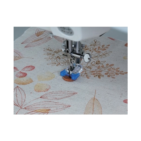 Quick and easy button sewing with the special button sewing foot. This foot has two bars that attach to the foot shank to provide extra stability and also has a textured, rubber sleeve to hold the button securely in place while sewing. Mainly for Janome sewing machines where the bobbin is loaded form the top.