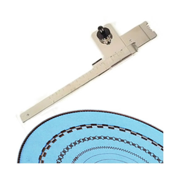 This Janome circular sewing attachment allows you to sew perfect circles with your sewing machine. It suitable for many Janome sewing machines by taking the place of the cover plate. Simply adjust the pivot pin on the ruler to your chosen radius, place the pivot pin through your fabric, replace the pin cap and start sewing. The Circular Sewing Attachment comes with instructions on how to attach and use it. Circles 5cm to 26cm in diameter are stitched perfectly using this very popular attachment so essential for craft and decorative work.