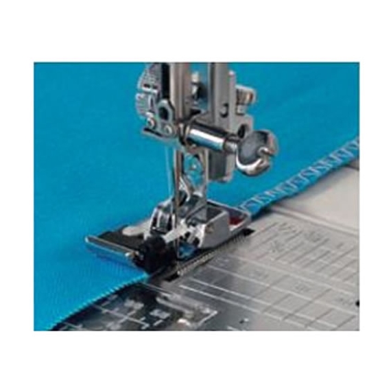 Use this Janome overlock / overcast / overedge foot with an overcasting stitch to allow thread to wrap around the edge of the fabric to prevent fraying. The foot guides the fabric and keeps the edges flat by compensating for the lack of friction when the needle makes the right-most stitch.