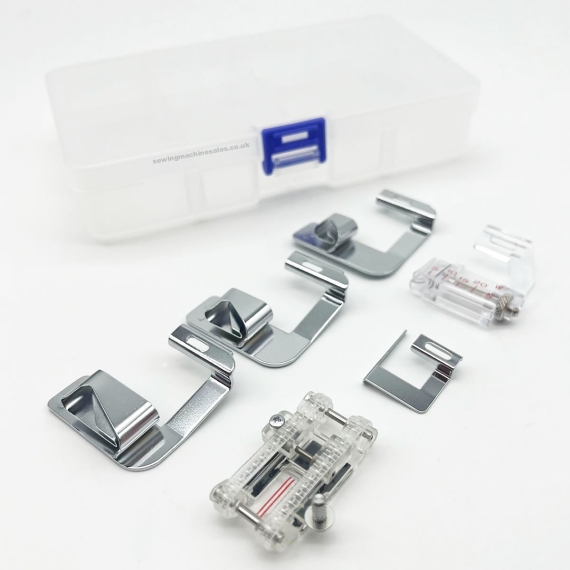 Wide rolled hem attachment, which allows 1", 3/4" and 1/2" hemming.