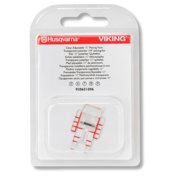 Husqvarna Clear 1/4 inch Piecing Foot, For clear visibility when 1/4 inch and 1/8 inch seams with straight stitch are desired. Guidelines to turn corners for 1/4 inch or 1/8 inch seams.