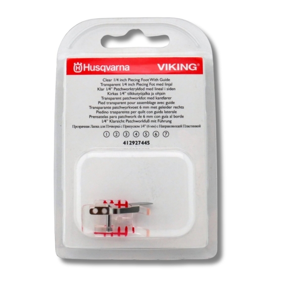 Husqvarna Clear 1/4 inch Piecing Foot with Guide, For stright stitch and hand look quilting stitch. Guide will help you keep the 1/4 inch distance. Clear means you have good visibility to view the sewing. For beginners as well as for experienced quilters.