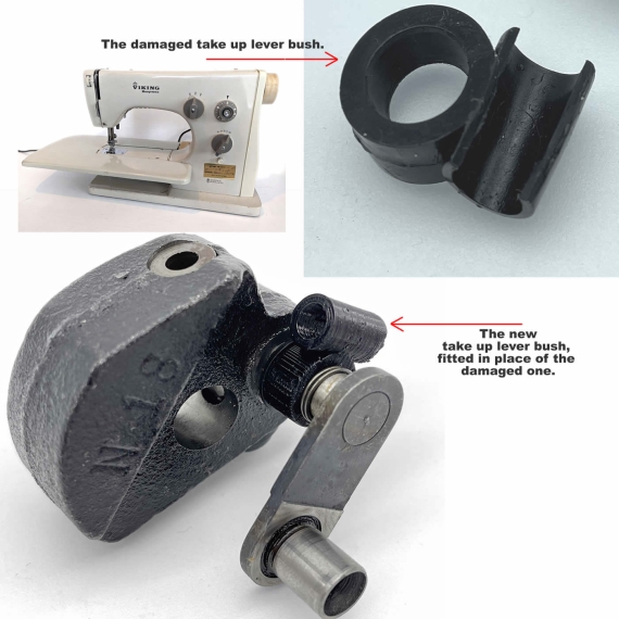 If this original part is damaged, the take-up-lever will make a banging noise as it becomes out of control, bashing into the metal frame of the machine body.